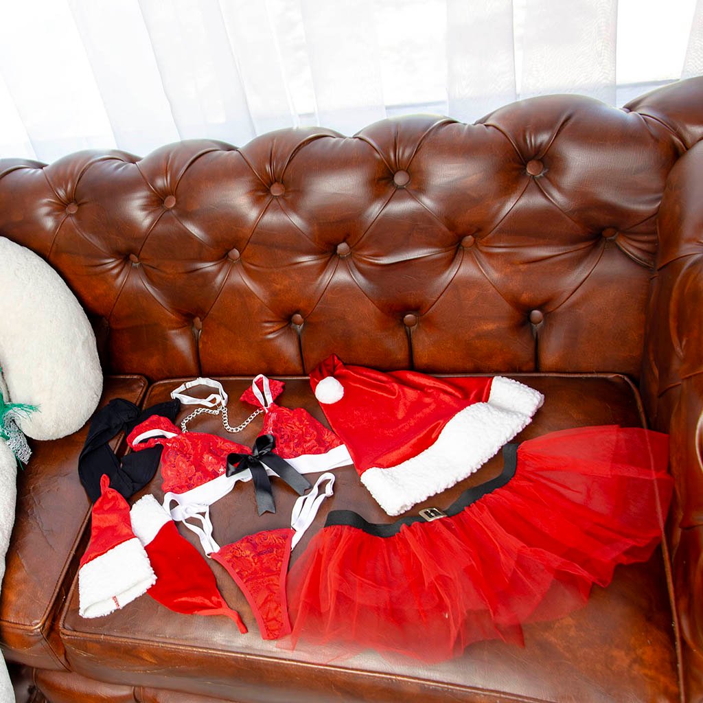 Incluye: Bralette, Panty, Falda, Guantes, Medias y Gorro.