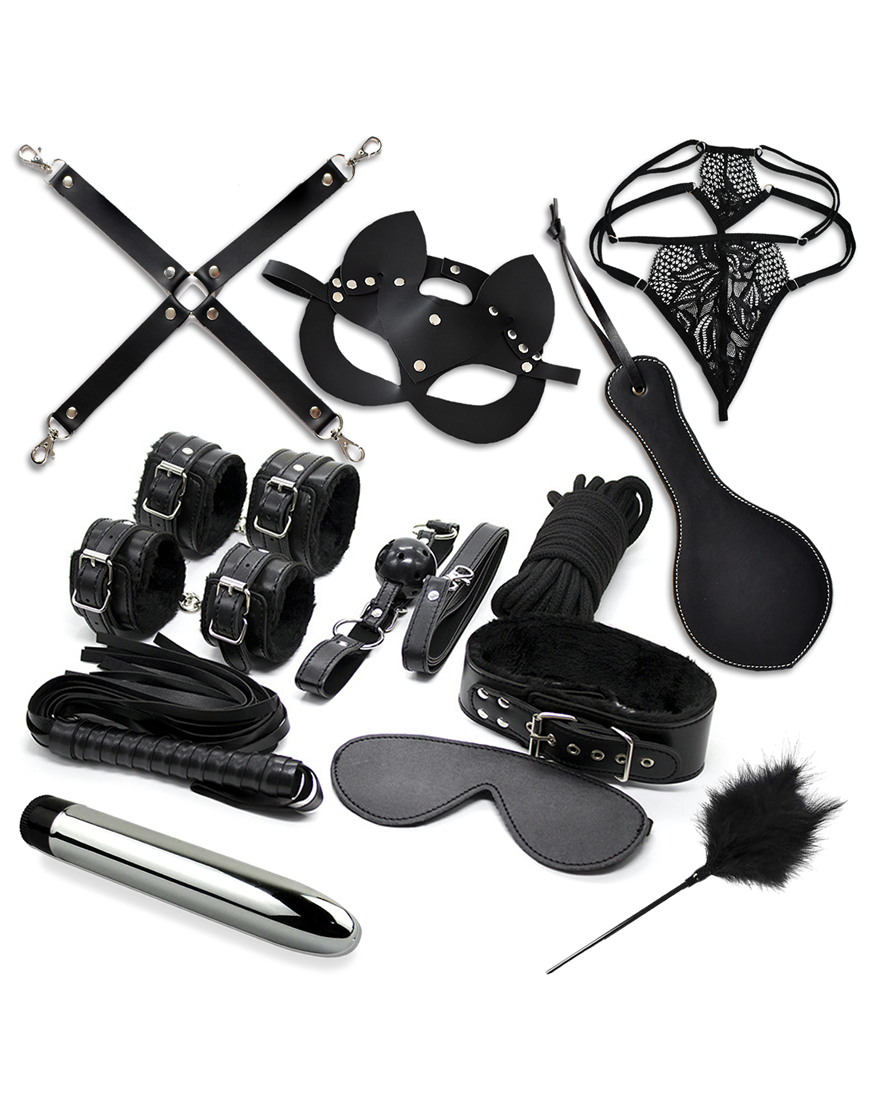 Súper kit: esposas de cuero manos y pies, collar de sumisión, antifaz, paleta, cruz, látigo, cordón, mordaza, plumero, máscara, bala vibradora plata. Un kit completo que te hará despertar y probar los más bajos instintos
